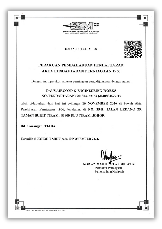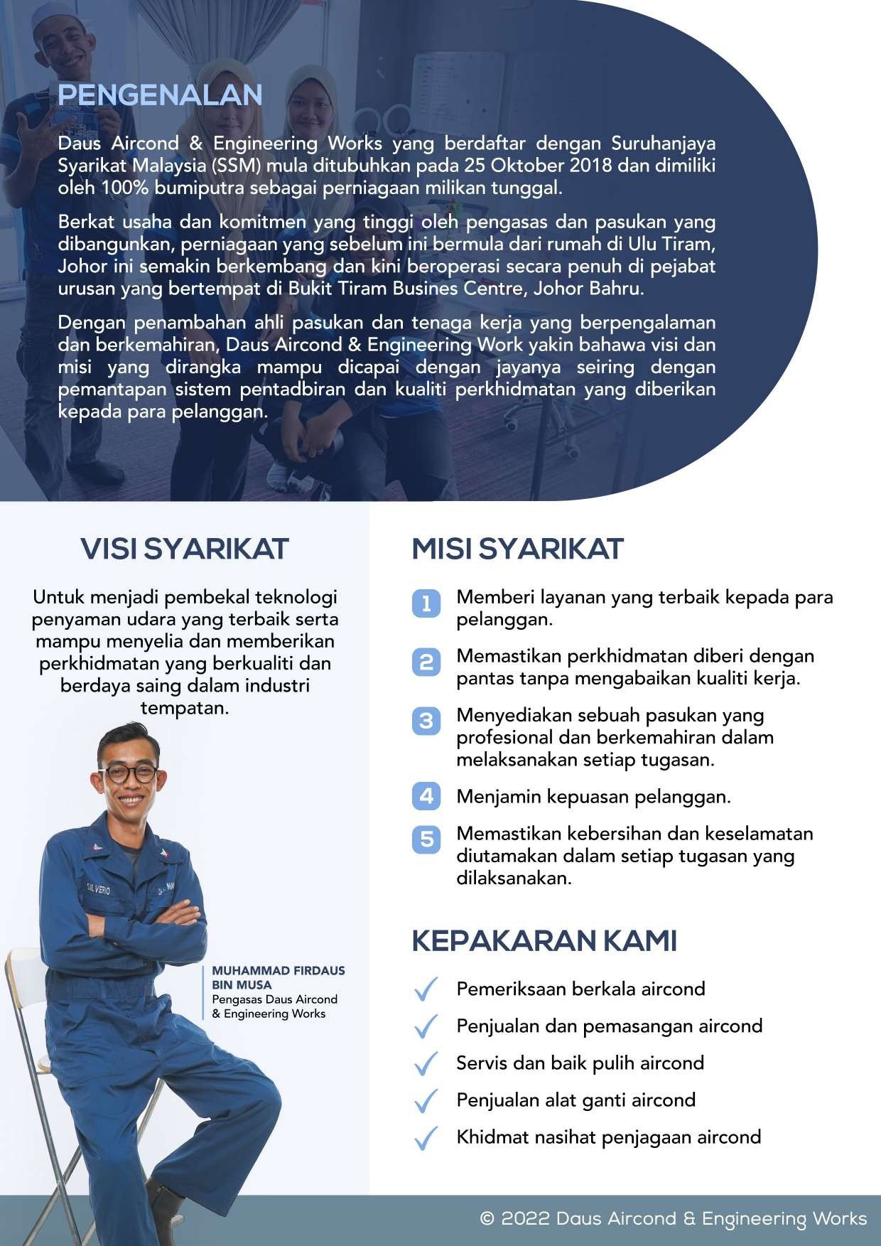 Daus Aircond & Engineering Works yang berdaftar dengan Suruhanjaya Syarikat Malaysia (SSM) mula ditubuhkan pada 25 Oktober 2018 dan dimiliki oleh 100% bumiputra sebagai perniagaan milikan tunggal.